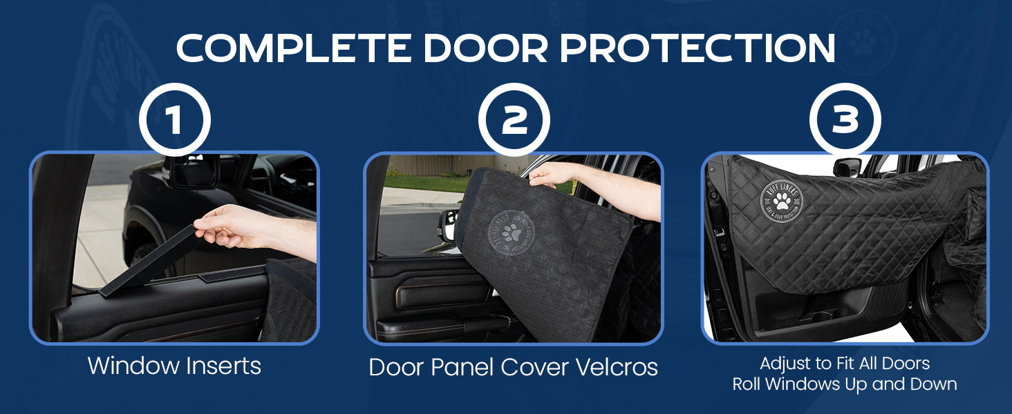 - DOOR PANEL PROTECTION: Our dog covers for cars back seat Velcro's to plastic window inserts that easily slide into the window seal so that the door panels are completely protected! You can open your doors, or roll your windows down, and the dog back seat cover stays in place. United States Patent No.: 12,221,024
